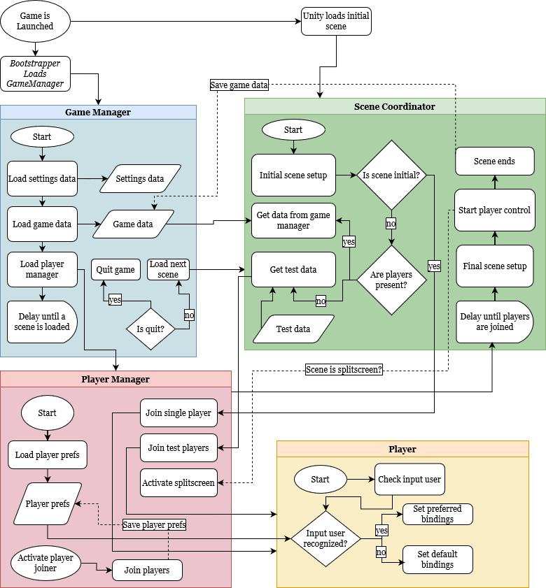 - Built for easy testing. The setup needs to be able to launch any scene from the Unity editor for testing purposes. I want to be able to easily edit any GameData that gets loaded when testing for easy debugging.